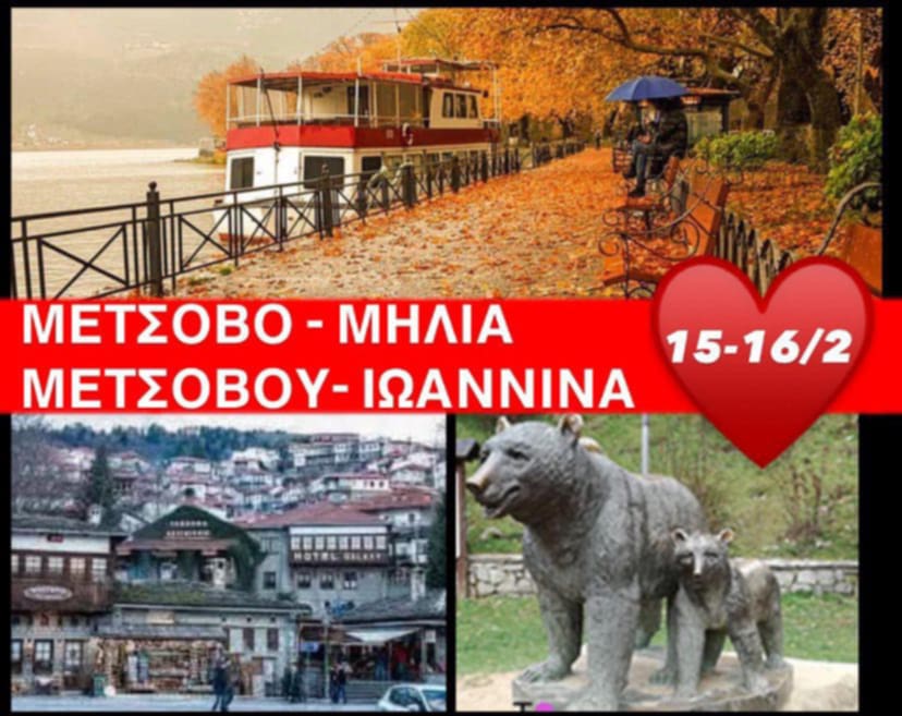 Αναχωρούμε στις 7 το πρωί από Σαλαμίνα , 7.40 από Πειραιά και 8.00 από Ομόνοια. Πραγματοποιούμε την πρώτη μας στάση για καφέ στην περιοχή της Ακράτας και στη συνέχεια θα κατευθυνθούμε προς την Μηλιά το χωριό κόσμημα της Βόρειας Πίνδου με το σπίτι της Αρκούδας και τα γραφικά σοκάκια (εδώ θα είναι το μεσημεριανό μας γεύμα) Συνεχίζουμε για το υπέροχο Μέτσοβο χτισμένο αμφιθεατρικά στις καταπράσινες πλαγιές της Πίνδου πάνω από τον Μετσοβοτικο ποταμό σε υψόμετρο 1200 μ. Το βλάχικο κεφαλοχώρι έχει αφήσει τη σφραγίδα του και συγκαταλέγεται σε έναν από τους τοπ προορισμούς της χώρας για αυτό άλλωστε και λέγεται»» Η Ελβετία της Ελλάδας «» τακτοποίηση στο ξενοδοχείο μας »Απόλλων »στο κέντρο του Μετσόβου Ελεύθερος χρόνος.Διανυκτερευση.