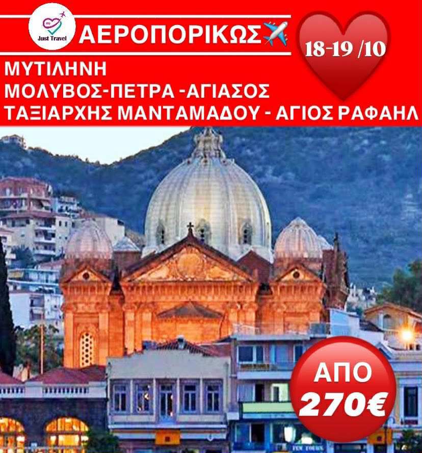 Θα συγκεντρωθούμε στο αεροδρόμιο της Αθήνας για να πάρουμε την πτήση μας για την όμορφη και αρχοντική Λέσβο.(όσοι ξεκινάμε από Σαλαμίνα θα μας μεταφέρει πούλμαν στο αεροδρόμιο ) Θα φτάσουμε στη Μυτιλήνη, την πρωτεύουσα της Λέσβου, από όπου θα αναχωρήσουμε για την πρώτη μας επίσκεψη που είναι το Μοναστήρι του Αγίου Ραφαήλ στη Θέρμη και συγκεκριμένα στην περιοχή Καρυές ,όπου φυλάσσονται τα λείψανα των Αγίων Ραφαήλ, Νικολάου και Ειρήνης που μαρτύρησαν στα χέρια των Τούρκων και τα οστά τους βρέθηκαν ύστερα από οράματα πιστών. Δεύτερος σταθμός μας το χωριό Μανταμάδος και η Μονή του Αγίου Ταξιάρχη, που είναι προστάτης του νησιού. Η εικόνα φτιάχτηκε από τη λάσπη και το αίμα των μοναχών που σφαγιάστηκαν από Σαρακηνούς πειρατές.
