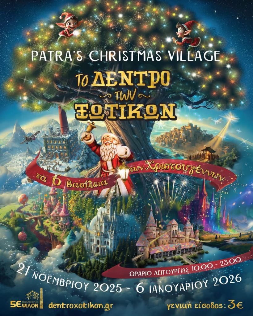 Πάμε μια υπέροχη ημερήσια εκδρομή στην γιορτινή πόλη της Πάτρας. Το παραμύθι ζωντανεύει και πάλι στο δέντρο των ξωτικών ,και η φλόγα της μαγείας λάμπει σαν παραμύθι. Το Δέντρο των ξωτικών αποτελεί το μοναδικό χριστουγεννιάτικο πάρκο της Ελλάδας που κάθε χρόνο διαδραματίζει μια διαφορετική ιστορία για μικρούς και μεγάλους. Θα έχουμε χρόνο και για προσκύνημα στον Ιερό ναό του Αγίου Ανδρέα τον πολυούχο της πόλης ανήμερα της γιορτής του.